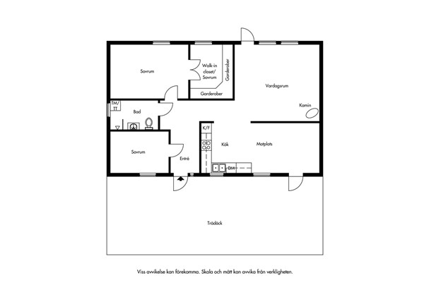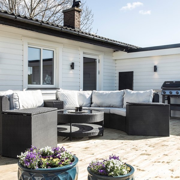 Trevligt kök i en alldeles lagom öppen planlösning med det mysiga vardagsrummet. Köket har en fin inredning i vitt från och arbetsbänkar av tålig grafitgrå laminat som passar fint till det vita kaklet. Överskåp med vitrin och fönster över vask/arbetsbänk gör det luftigt och trivsamt. Den maskinella utrustningen består av kyl/frys, diskmaskin, induktionshäll, fläkt och ugn, allt från Siemens 2020 då köket renoverades. Vid sidan om arbetsköket finns en rymlig matplats med plats för 6-10 gäster kring bordet. En helglasad dörr leder ut till det stora nybyggda trädäcket med sol från morgon till kväll. Nylagt vinylgolv som i hall och vardagsrum och målade släta väggar i en dov beige ton.