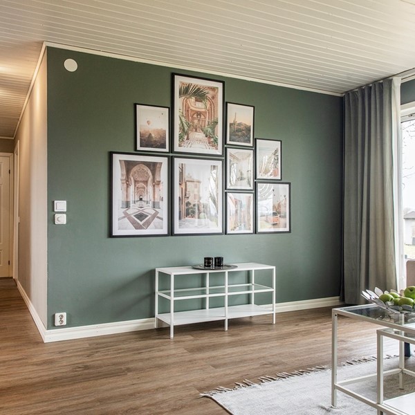Mysigt vardagsrum med en fin kamin som ger en skön extra värme och gemytliga kvällar framför brasan. Ett flertal fönster samt altandörr med låg bröstning ger ett fint ljus och en god kontakt med uteplatsen och inte minst, en härlig utsikt. Rummet har målade släta väggar i en vacker dimgrön ton som passar fint till vinylgolvet i dovt bruna toner. Det synliga teglet bakom kaminen ger tillsammans med rustika detaljer en charmig karaktär.