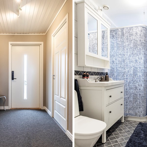 Ljus och rymlig hall med plats för hatthylla och krokar. En smart skoförvaring ger bra utrymme och fungerar samtidigt som en praktisk avlastningshylla. Nylagt tåligt vinylgolv i en behaglig brun ton och målade väggar i en matchande nyans.