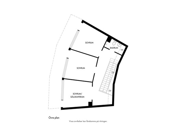 Den karaktäristiska trappan med takfönster leder dig upp på bostadens övre plan. Detta våningsplan består av tre väldimensionerade sovrum med plats för garderober och bord, samtliga med fransk balkong. Ett helkaklat badrum (renoverades 2019) med wc, vask, spegelskåp och dusch ligger praktiskt placerad i ena änden av hallen. Ovanvåningen erbjuder även plats för ett hemmakontor i den möblerbara hallen. Genomgående parkett klär in golvet och harmonierar fint med de ljusare väggarna. Flera takfönster tillsammans med den generösa takhöjden skänker en fantastisk rymd till detta våningsplan.