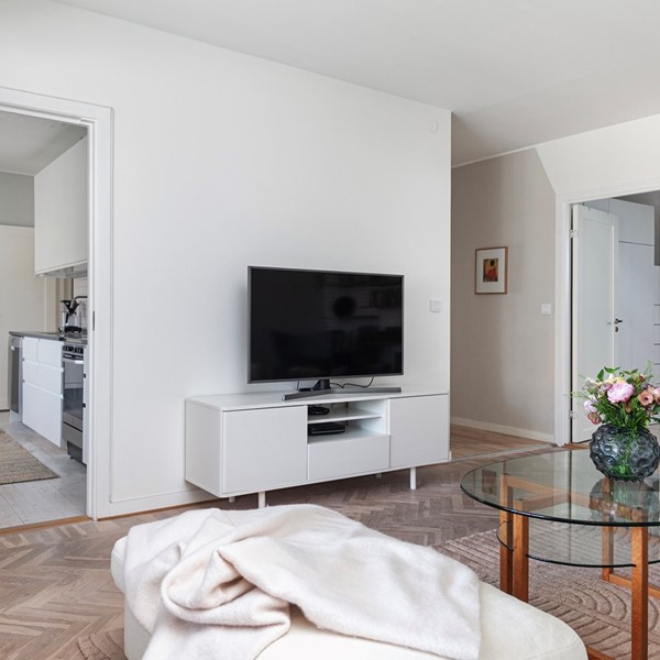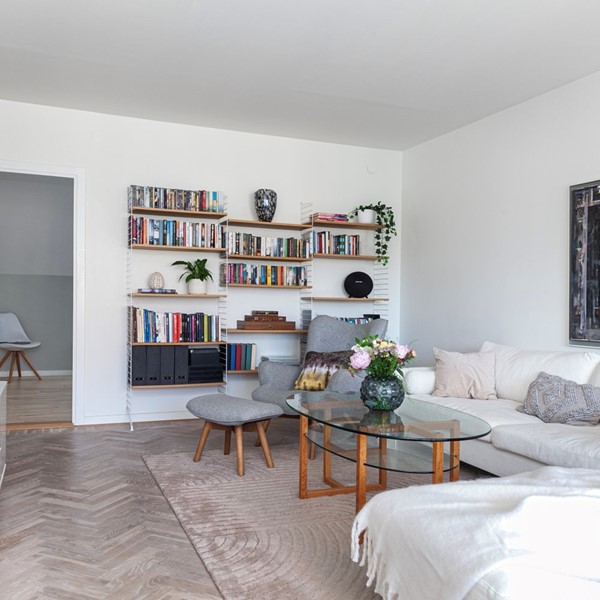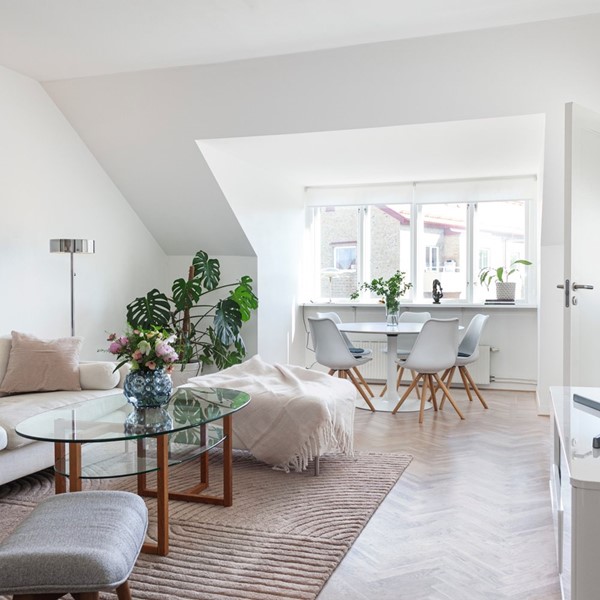 Det synnerligen trivsamma vardagsrummet har stora fönster i härligt sydvästläge vilket skänker bostaden ett fint ljus. Vardagsrummet är lättmöblerat och här finns gott om plats för både soffa och tv-möblemang. Den fina fiskbensparketten och snedtaken förhöjer mysfaktorn och bidrar till att göra detta till ett rum man verkligen trivs i.
