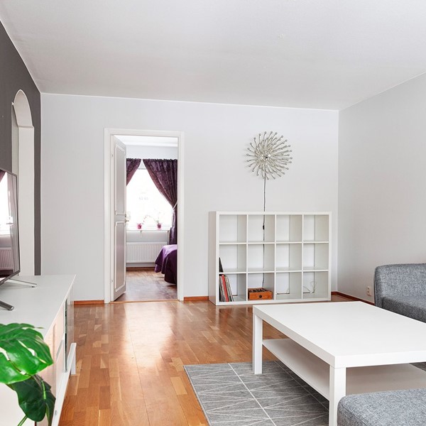 Lägenheten erbjuder även ett större rogivande sovrum med gott om plats för dubbelsäng och kompletterande möbler.