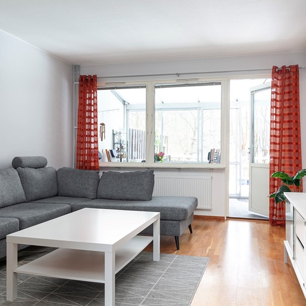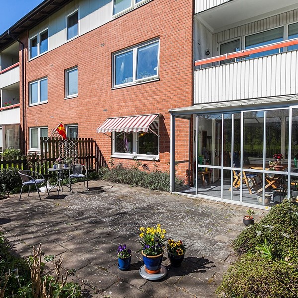 Från vardagsrummet når du det inglasade uterummet i mysigt läge. Vidare från uterummet ligger den härliga och väl tilltagna uteplatsen. Detta är en liten oas där du kan njuta av solens strålar och lugnet i goda vänners lag.