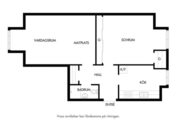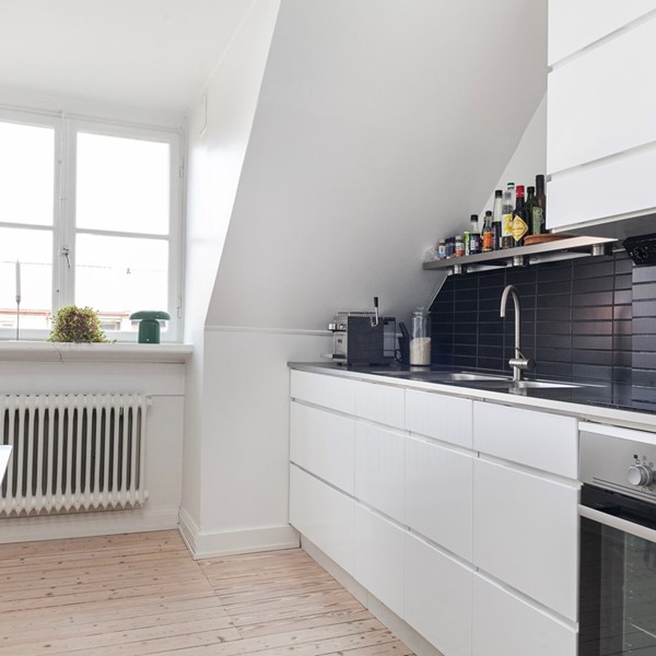 Köket är praktiskt och stilrent med vita skåpsluckor och ett svart stänkskydd som en snygg kontrast. Köket har alla vitvaror du kan tänkas behöva. Här finns plats för ett mindre bord med stolar samtidigt som ett fint ljusinsläpp gör rummet både trivsamt och luftigt.