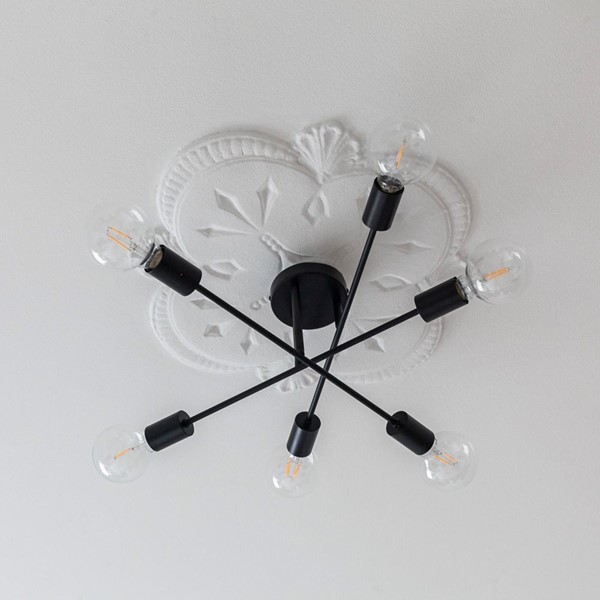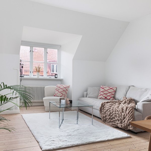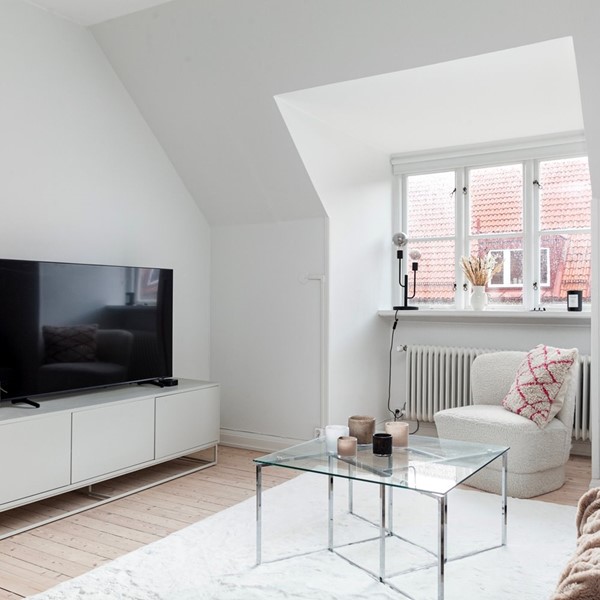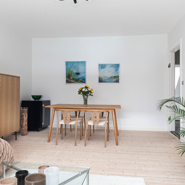 Vardagsrummet är ljust och rymligt med gott om plats för både en bekväm soffgrupp och ett matbord. Detta gör rummen till en naturlig samlingspunkt för både vardag och trevligt umgänge. En vacker takrosett förstärker rummets karaktär.